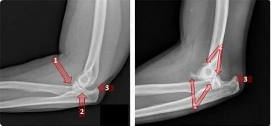 Figure: Xrays of elbow fracture dislocations. #1 shows the break in the radius. #2 shows the break in the ulna. #3 shows the elbow joint completely out of place, or dislocated.
